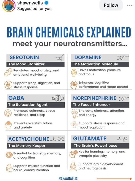 Found this great post explaining our brain chemicals, symptoms of deficiencies and related food and exercises for each one.