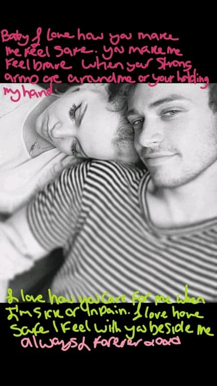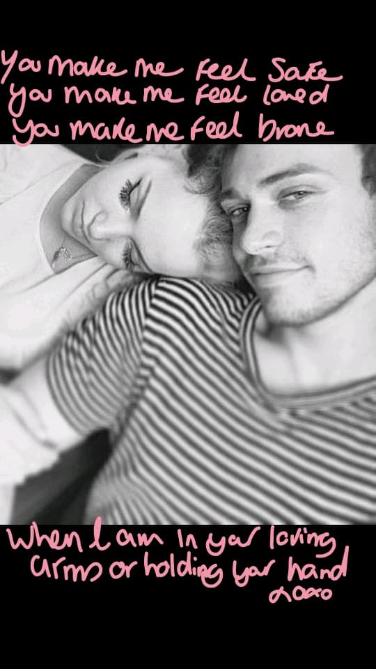 Baby I love how you make me feel safe You make me feel brave When your strong arms are around me or your holding my hand I love how you care for me when I'm sick or in pain I love how safe I feel with you beside me Always and forever You make me feel safe You make me feel loved You make me feel brave When I'm in your arms or holding my hand When I feel your hand in mine even when I'm sleeping I feel safe and loved